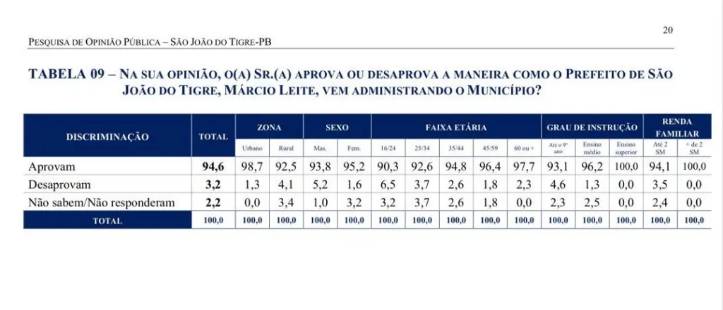 A gestão municipal de São João do Tigre, sob o comando do prefeito Márcio Leite, é aprovada por 94,6% da população do município. É o que aponta uma pesquisa do Instituto Opinião, realizada no município neste mês de março.