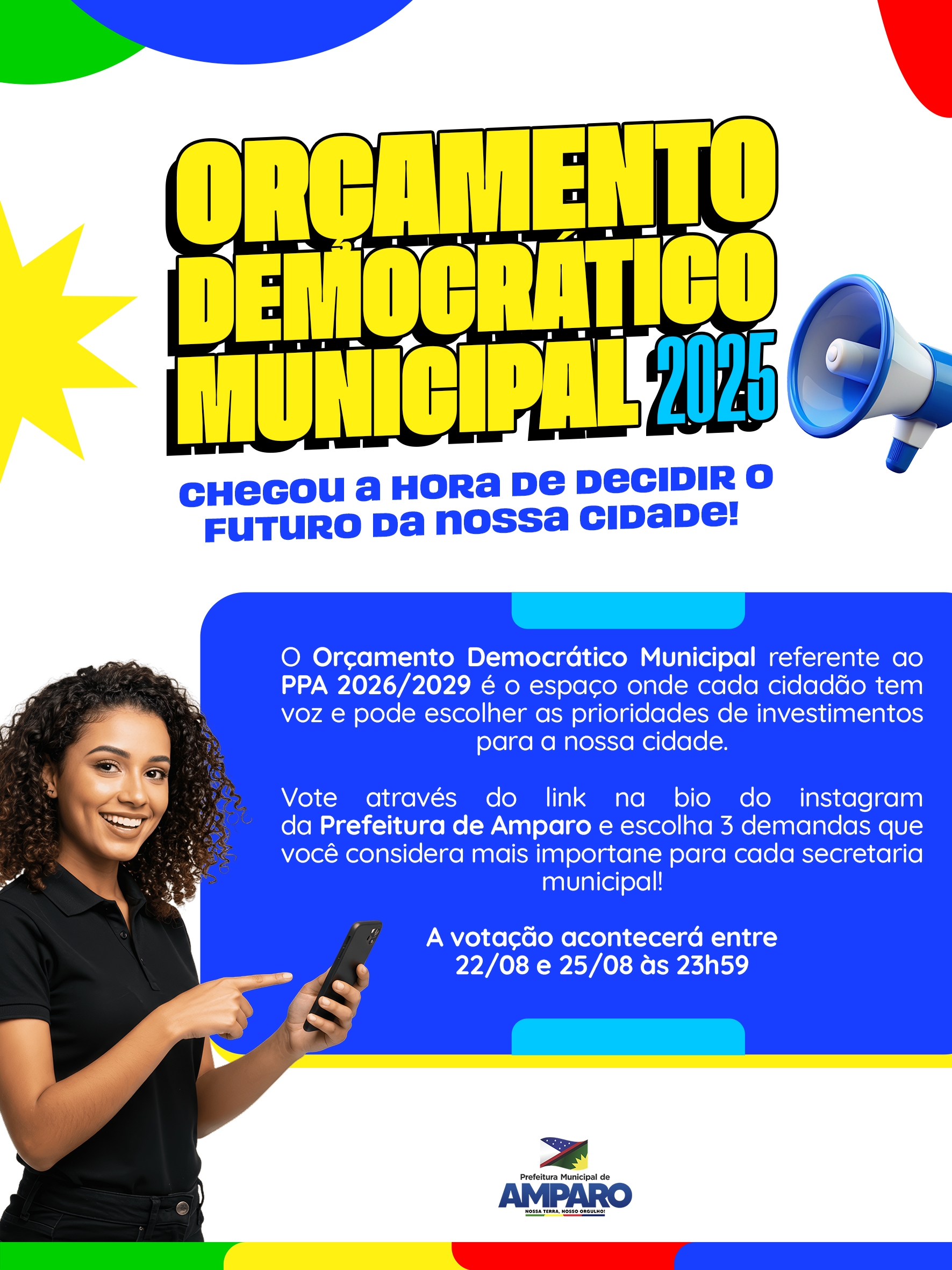 A Prefeitura de Amparo iniciou o processo do Orçamento Democrático Municipal 2025, uma ação que garante à população a oportunidade de participar diretamente das decisões sobre os investimentos e prioridades da cidade. A votação definirá as demandas que farão parte do Plano Plurianual (PPA) 2026/2029.