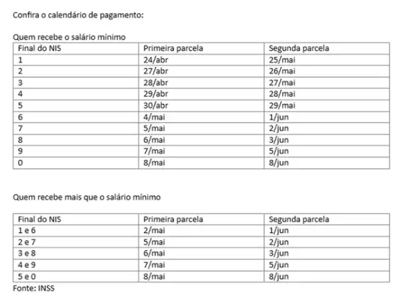 O benefício extra será pago em duas parcelas. A primeira será paga nesta sexta até 8 de maio. A segunda vai de 25 de maio a 8 de junho. As datas são definidas com base no dígito final do Número de Inscrição Social (NIS) e com base na renda do beneficiário. Quem ganha apenas o salário mínimo começa a receber antes de quem recebe mais que o mínimo.