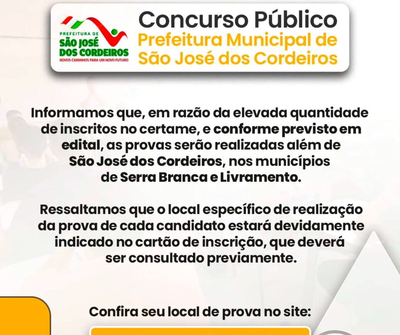 De acordo com a banca organizadora, o número elevado de candidatos tornou necessária a ampliação dos locais de prova. Além de São José dos Cordeiros, as avaliações também serão realizadas nos municípios de Serra Branca e Livramento.
