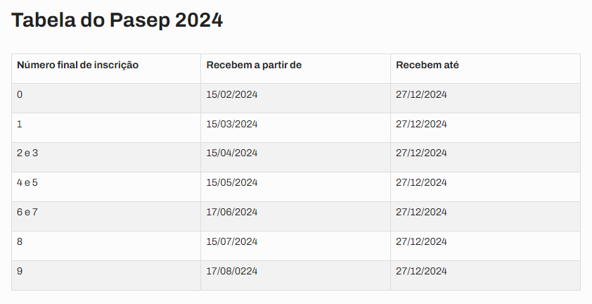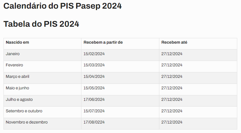 O calendário do PIS Pasep é dividido em seis lotes, baseados no mês de nascimento, no caso do PIS, e no número final de inscrição, no caso do Pasep. O saque começa no dia 15 de fevereiro e acabará em 27 de dezembro de 2024. Após esse prazo, será necessário aguardar convocação especial do Ministério do Trabalho e Previdência.
