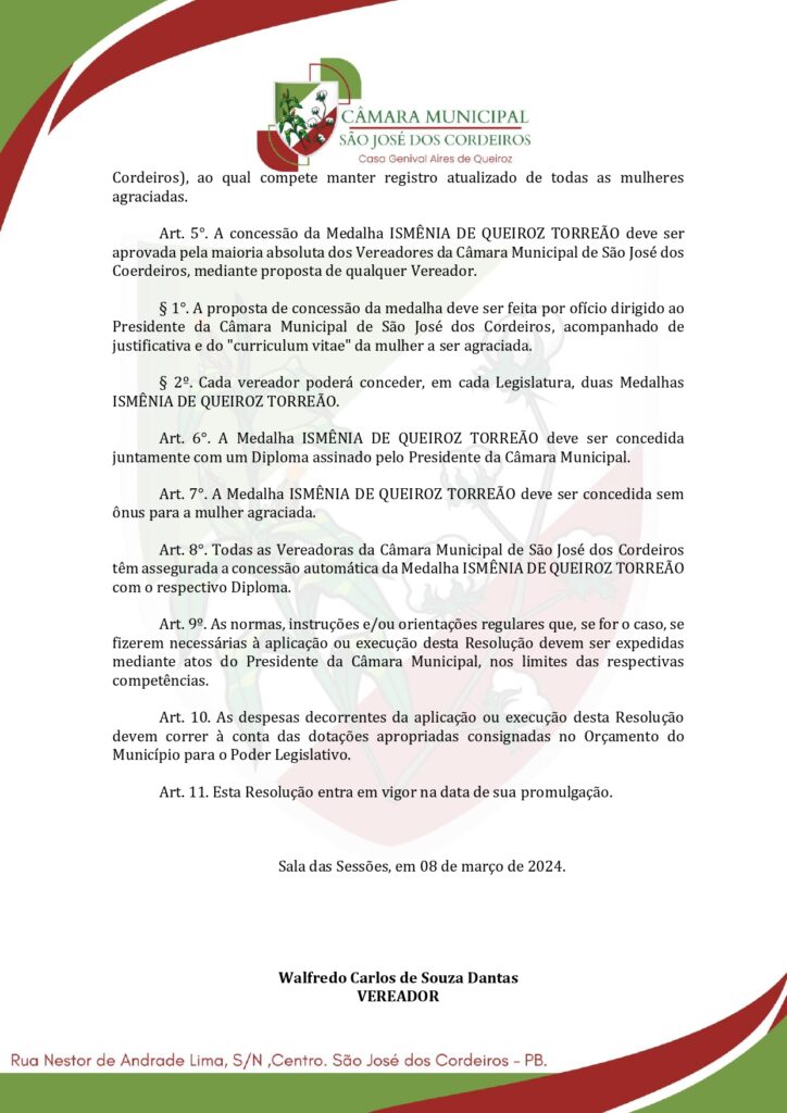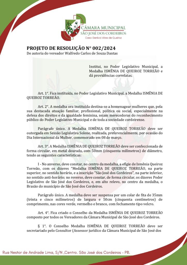 Conforme a propositura, “a medalha ora instituída destina-se a homenagear mulheres que, pela sua destacada atuação familiar, profissional, política ou social, especialmente na defesa dos direitos e da igualdade feminina, sejam merecedoras do reconhecimento público do Poder Legislativo Municipal e de toda a sociedade cordeirense”.