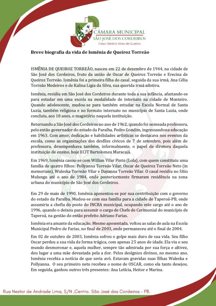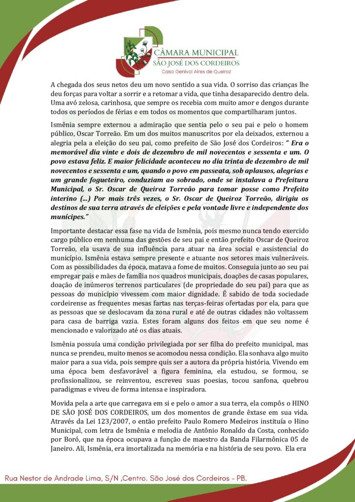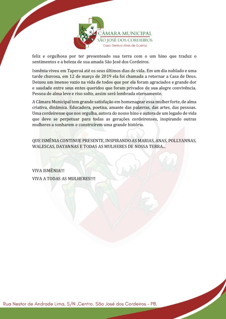 Em meio a tanto emoção, após documentário produzido pelo Poder Legislativo, contando a história e vida da autora do Hino Municipal, os parlamentarem instituíram a medalha menção honrosa a Senhora Ismênia de Queiroz Torreão.