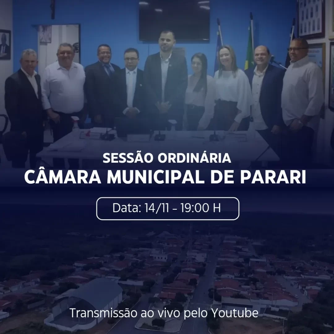 A Câmara Municipal de Parari realizará, hoje(14/11), a partir das 19h, mais uma sessão ordinária na sede do Poder Legislativo. A reunião integra o calendário oficial de atividades da Casa e tem como objetivo discutir pautas e propostas de interesse público.