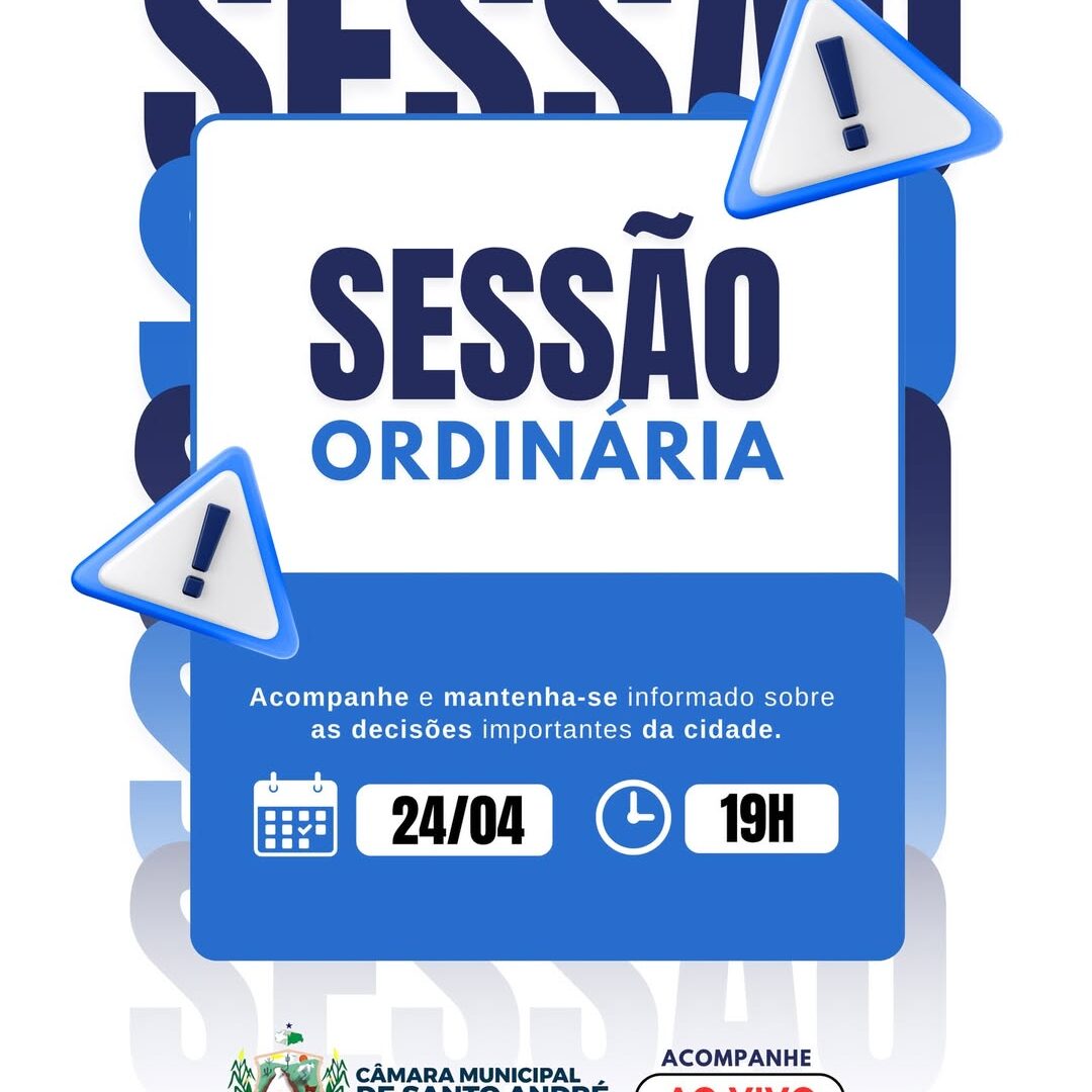 A Câmara Municipal de Santo André, na Paraíba, realiza nesta sexta-feira (24) mais uma sessão ordinária. O encontro está marcado para às 19h, na sede do Legislativo, Casa João Olinto de Queiroz.