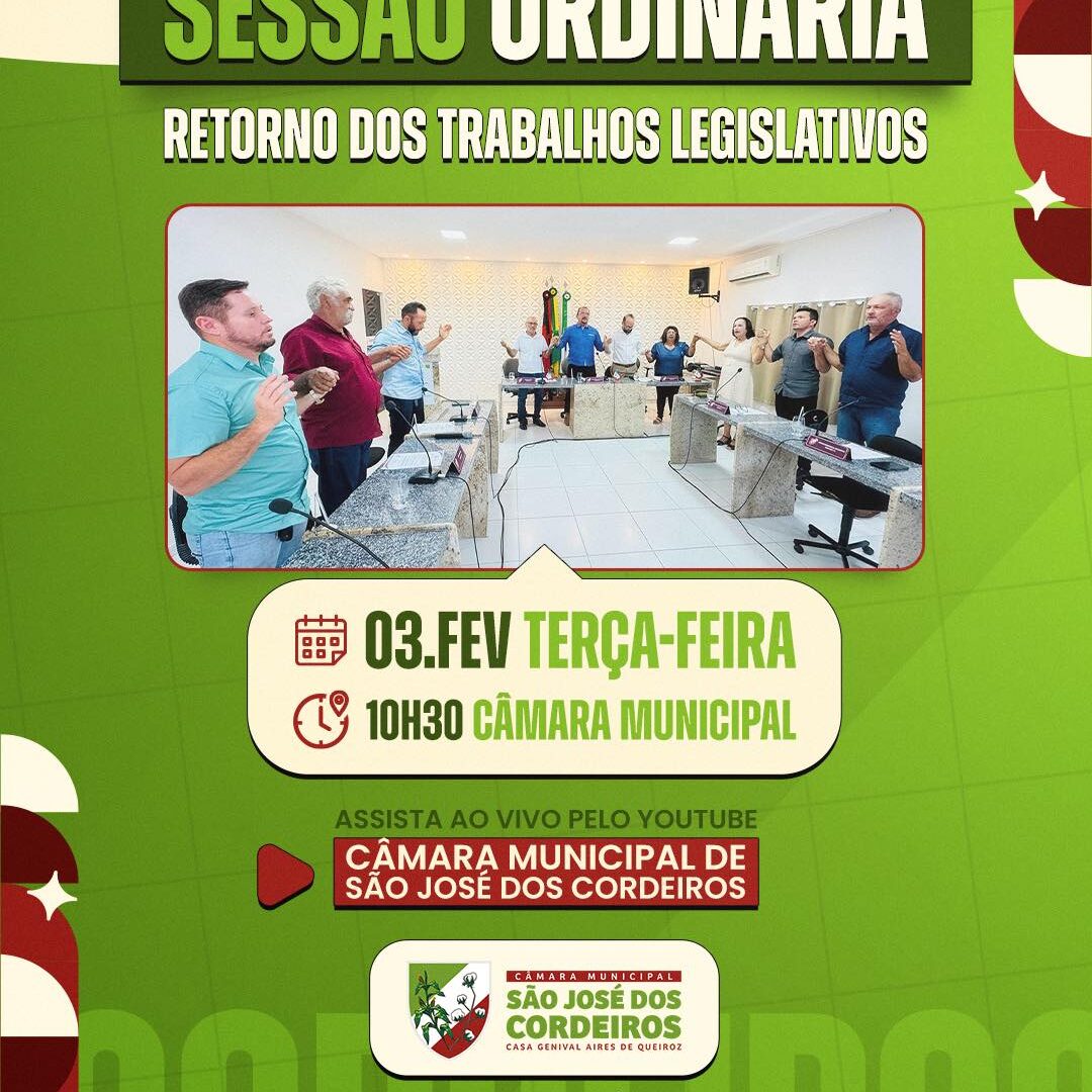 A Câmara Municipal de São José dos Cordeiros dará início, na próxima terça-feira, dia 03 de fevereiro, aos trabalhos legislativos referentes ao ano de 2026, com a realização da primeira sessão ordinária do período.