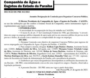 O concurso da Companhia de Águas e Esgotos da Paraíba (Cagepa) ganhou mais um importante passo ontem (21). É que foi designada pela empresa a comissão que deverá organizar o certame. Segundo apurou o ClickPB, a medida consta na edição desta terça-feira (22) do Diário Oficial do Estado (DOE) e é assinada pelo presidente da companhia, Marcus Vinícius.