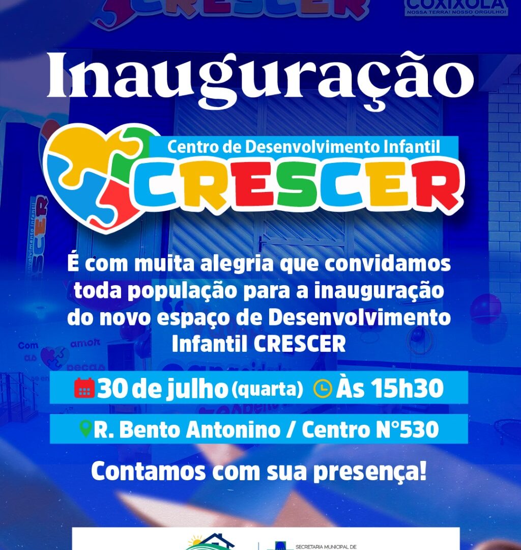 A Prefeitura de Coxixola, por meio da gestão do prefeito Nelsinho Honorato, inaugura nesta quarta-feira, 30 de julho, o novo Centro de Desenvolvimento Infantil CRESCER — um espaço moderno e acolhedor, totalmente voltado ao cuidado e ao desenvolvimento das crianças do município.