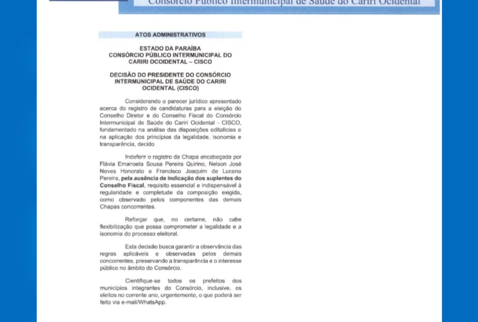 Por outro lado, a chapa liderada pela prefeita do Congo, Flávia Quirino teve seu registro indeferido. De acordo com a decisão do CISCO publicada pelo consórcio, a ausência da indicação dos suplentes do Conselho Fiscal inviabilizou sua validação. A decisão, fundamentada em parecer jurídico, destacou que o preenchimento completo dos cargos é essencial para garantir a regularidade do processo.