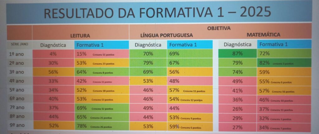 Os dados apresentados mostram crescimento de até 32 pontos no quesito Leitura, em turmas do 7° ano, em relação à avaliação diagnóstica para a formativa, seguidos de crescimentos ainda de 26,23, 21, 18 e 11 pontos, em outras turmas.