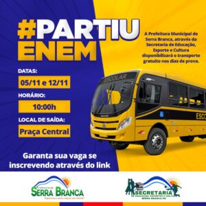 A Prefeitura de Serra Branca, através da Secretaria de Educação e Cultura, informa que mais uma vez irá fornecer transporte gratuito para estudantes que se inscreveram para realizar o Exame Nacional do Ensino Médio (ENEM) 2023.