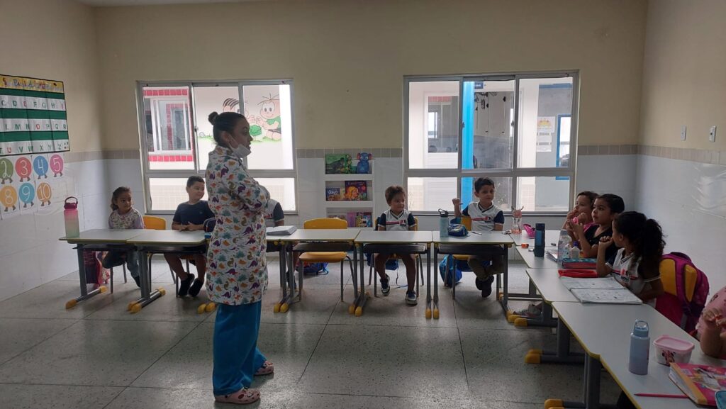 1ª etapa – Palestra educativa: Os alunos participam de uma conversa orientativa sobre a importância da saúde bucal e os cuidados necessários no dia a dia.