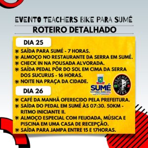 O município de Sumé receberá neste fim de semana (25 e 26) pela segunda vez o Teachers Bike: Pedalando em Sumé, um evento que reúne 34 ciclistas de João Pessoa que virão pedalar com cliclista de Sumé.