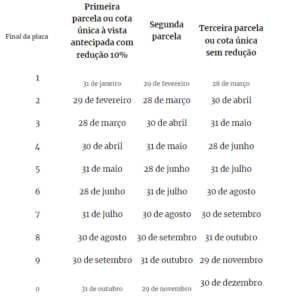 A data limite do vencimento para pagamento antecipado com desconto de 10% será o último dia útil de cada mês, no período de janeiro a outubro. O número final da placa do veículo define o mês de pagamento antecipado.