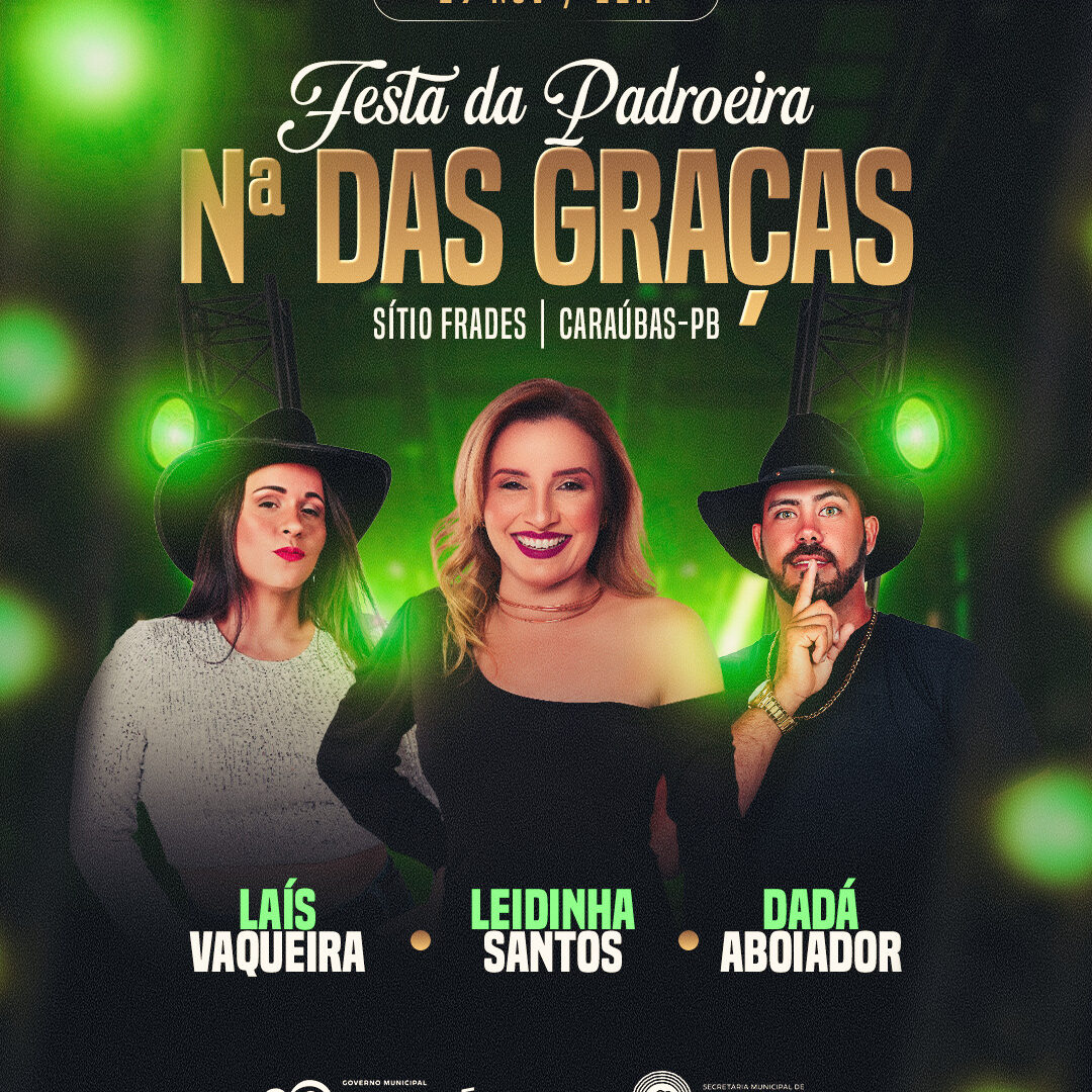 A tradicional Festa da Padroeira Nossa Senhora das Graças será realizada nesta sexta-feira (29/11), a partir das 22h, no Sítio Frades, em Caraúbas, cariri paraibano. O evento contará com shows de Laís Vaqueira, Leidinha Santos e Dadá Aboiador, garantindo uma noite de muita animação e valorização da cultura local.