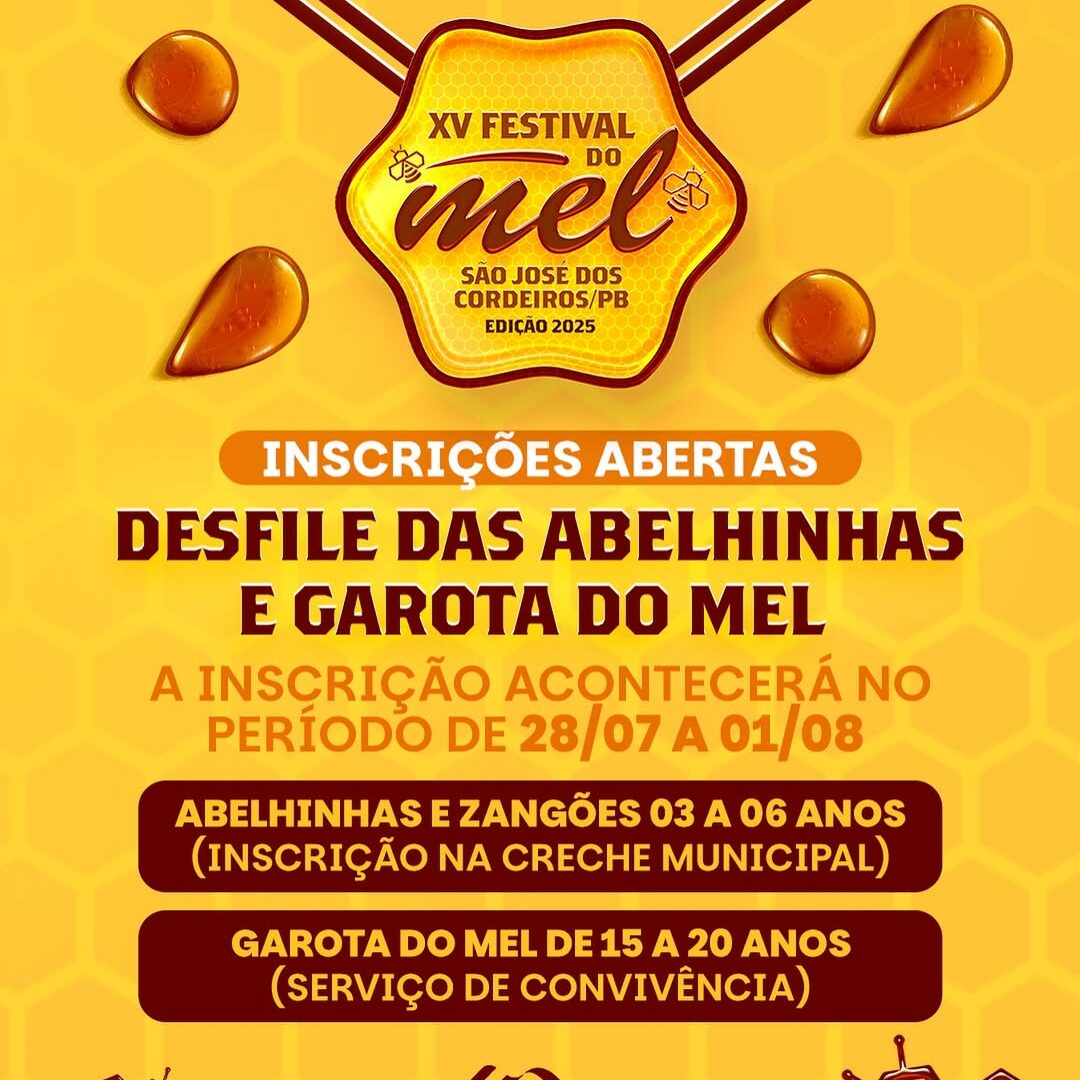 São José dos Cordeiros já respira o clima do aguardado Festival do Mel 2025, e uma das atrações mais tradicionais e encantadoras da programação está prestes a começar: os concursos “Garota do Mel” e das “Abelhinhas e Zangões”. As inscrições estarão abertas a partir da próxima segunda-feira(28/07), e seguem até o dia 1º de agosto.