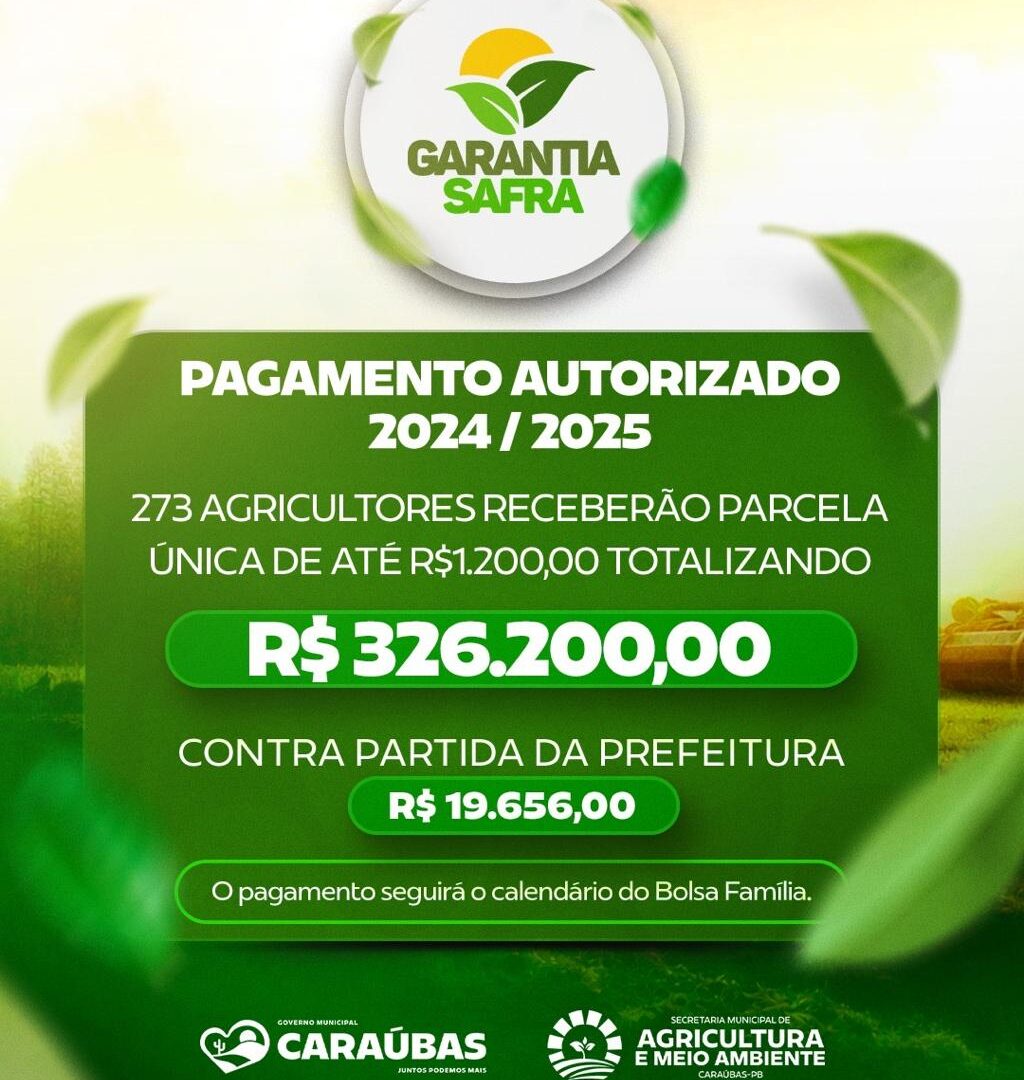 A Prefeitura de Caraúbas anunciou a liberação do pagamento do Garantia Safra referente ao ciclo 2024/2025, contemplando 273 agricultores do município. Cada beneficiário receberá uma parcela única de até R$ 1.200, totalizando um investimento de R$ 326.200,00 na economia local.