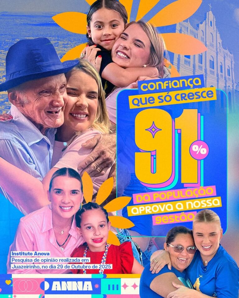 A prefeita Anna Virgínia (Republicanos) vive um dos momentos mais expressivos da política paraibana. Segundo pesquisa do Instituto Anova, realizada no dia 29 de outubro, 91,2% da população de Juazeirinho aprova a sua gestão — um número que ultrapassa estatísticas e traduz a confiança e o reconhecimento de um povo que enxerga na gestora uma liderança firme, humana e transformadora.