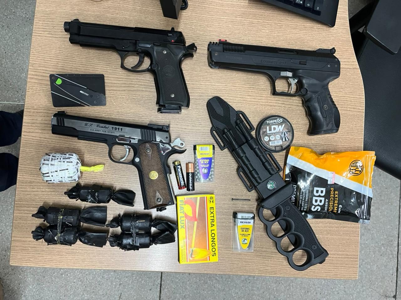 De acordo com o delegado João Ricardo, o homem foi encontrado com bombas caseiras enroladas com pregos. Além de dois simulacros de armas de fogo, uma pistola airsoft, uma faca tática e um canivete disfarçado em forma de cartão de crédito.