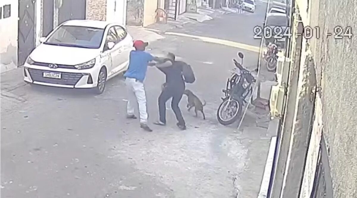 Depois de iniciarem uma discussão, os dois trocam socos. O homem de preto, então, saca a arma de fogo e dispara. Porém, o rival reage e pega a mesma arma que o atingiu e atira. Ao todo, foram efetuados seis disparos.