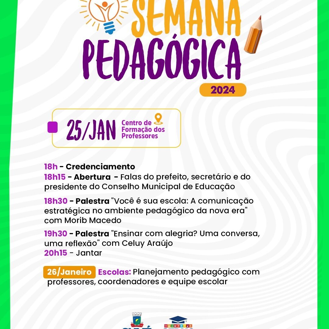 A Prefeitura de Sumé por meio da Secretaria de Educação está ultimando os preparativos para o início do ano letivo 2024 e dentre eles, a realização da Semana Pedagógica que reunirá, em dois dias de trabalho e conhecimentos intensivos, os professores, diretores, colaboradores de coordenação pedagógica.