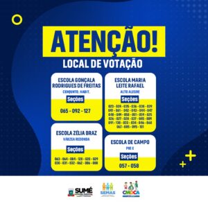 • A Escola Zélia Braz, localizada na Várzea Redonda, abrigará as seções: 063; 064; 084; 128; 020; 029; 030; 031; 032; 062; 086; 088;
