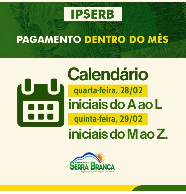 O Instituto de Previdência dos Servidores Municipais de Serra Branca, anunciou que estará realizando o pagamento dos seus aposentados e pensionistas referente ao mês de fevereiro.