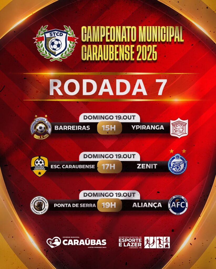 O Campeonato Caraubense de Futebol continua movimentando os desportistas do município de Caraúbas e de toda a região. Neste próximo domingo, dia 19, o Estádio Municipal José Valderí Neves será palco da sétima rodada da competição, que promete fortes emoções e muito equilíbrio dentro de campo.