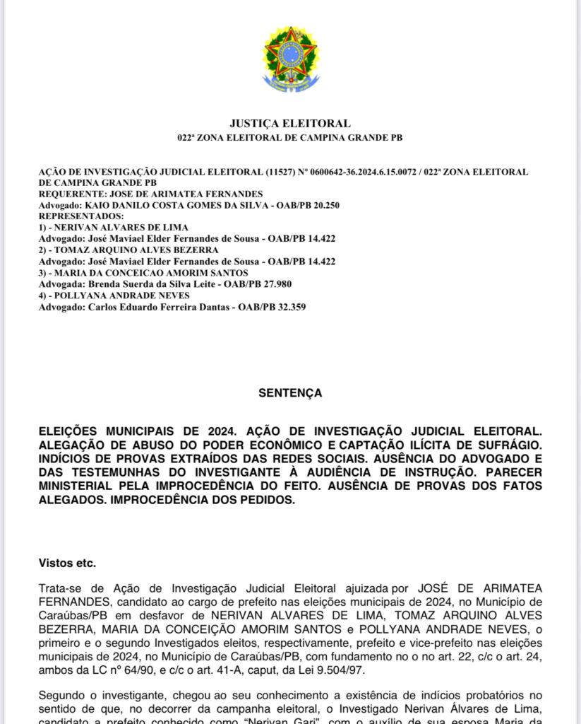 A Justiça Eleitoral da 022ª Zona Eleitoral de Campina Grande julgou improcedente a ação movida pela oposição de Caraúbas contra o prefeito Nerivan Alves, conhecido como “o Gari”, e o vice-prefeito Tomaz Bezerra. A decisão representa uma vitória para os gestores municipais, que eram acusados de abuso de poder econômico e captação ilícita de sufrágio nas eleições municipais de 2024. A denúncia foi encabeçada por José de Arimatea (Teinha), que foi candidato apoiado pelo ex-prefeito Silvano e foi derrotado nas urnas.