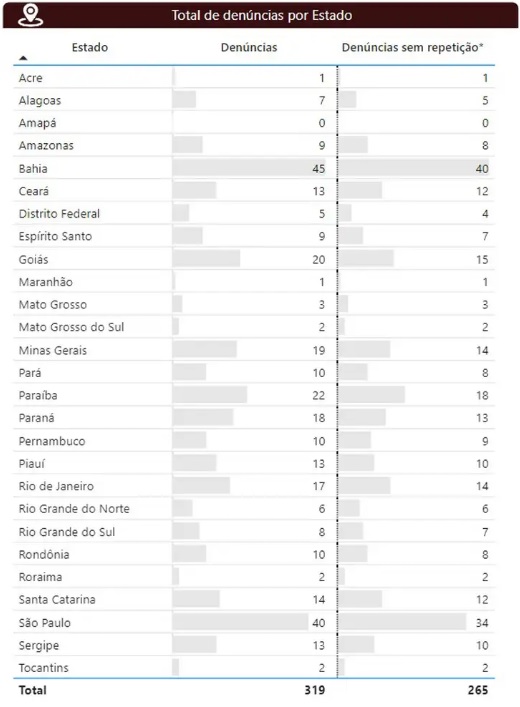 O MPT registrou diferentes formas de assédio, com ocorrências em todos os estados, exceto Amapá. Bahia, São Paulo, Paraíba, Goiás e Minas Gerais são os estados com mais denúncias, contabilizando 45, 40, 22, 20 e 19 casos, respectivamente.