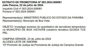 Ministério Público da Paraíba abriu um inquérito civil para apurar o excesso de servidores temporários no município de Boa Vista, no agreste da Paraíba. A informação foi publicada no diário oficial do MPPB da quarta-feira (24) e a ação é do promotor Alcides Leite de Amorim.