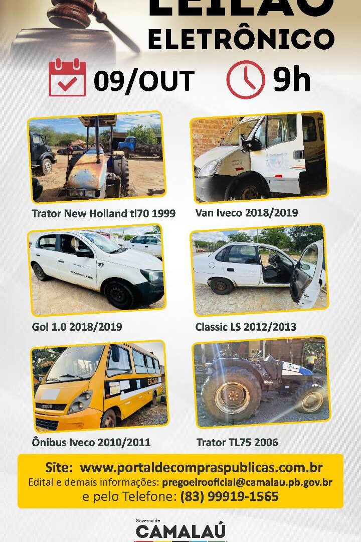 O município de Camalaú, situado no Cariri paraibano, realizará no próximo dia 09 de outubro, a partir das 9h, um leilão eletrônico com diversos bens inservíveis disponíveis para arremate.