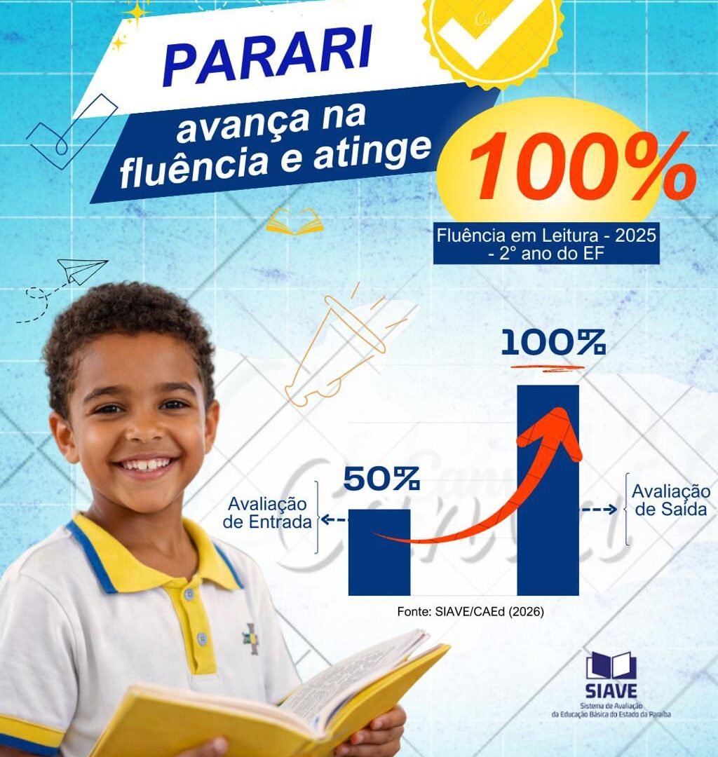 A cidade de Parari vive um dia de grande alegria e celebração com a divulgação dos resultados da Prova de Fluência Leitora 2025. O município alcançou um marco histórico: 100% dos alunos avaliados foram considerados fluentes, um resultado que enche de orgulho toda a comunidade escolar e reafirma que a educação de Parari segue no caminho certo.