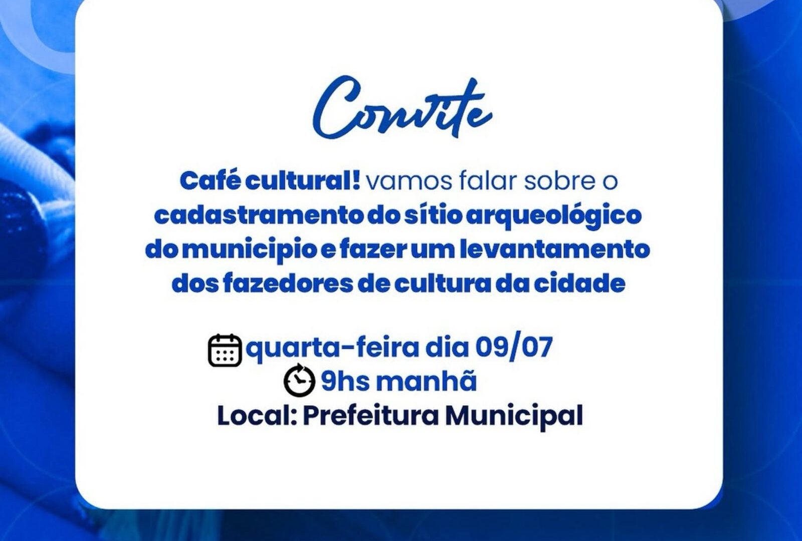 A Prefeitura Municipal de Parari convida toda a população para participar de um momento especial de valorização da cultura local. Na próxima quarta-feira, dia 09 de julho, às 9h da manhã, será realizado o Café Cultural, com o objetivo de discutir o cadastramento do sítio arqueológico do município e promover um levantamento dos fazedores de cultura da cidade.