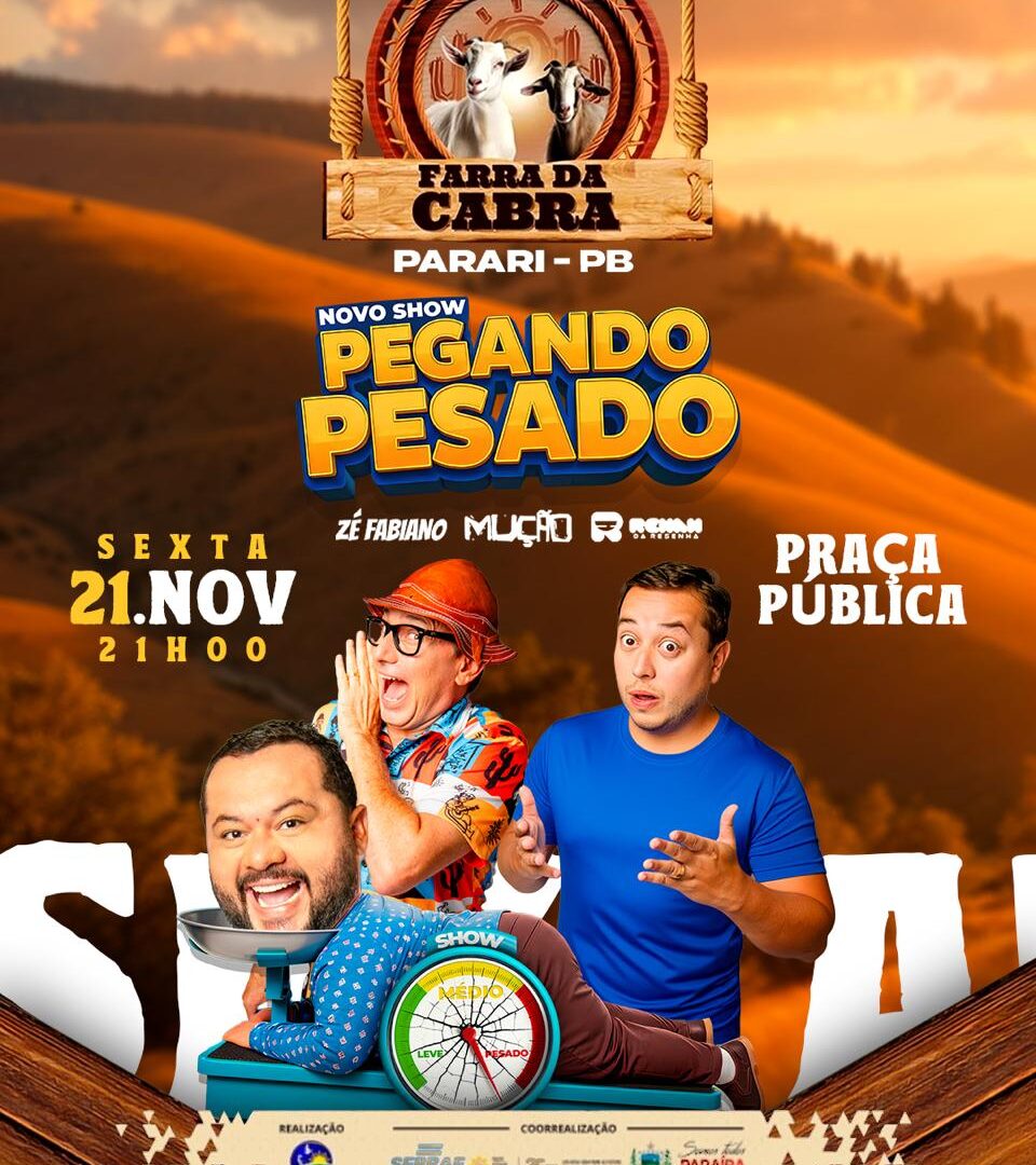O município de Parari, no Cariri paraibano, realiza nesta sexta-feira (21/11), a primeira edição da Farra da Cabra, um evento que promete movimentar toda a região. A programação festiva terá início às 21h, na praça pública, com o novo show humorístico “Pegando Pesado”, estrelado por três grandes nomes do humor nordestino: Zé Fabianno, Mução e Renan.