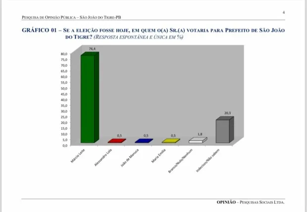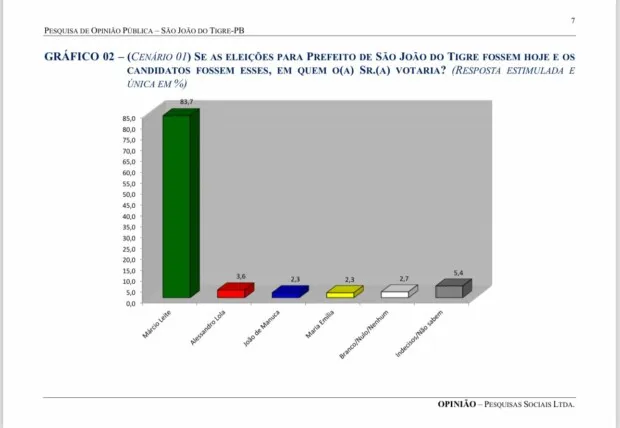 Na pesquisa estimulada, o prefeito Márcio aumenta sua margem, e chega a 83,7%, contra Alessandro de Lola, com 3,6%, João de Manuca com 2,3, e Maria Emília com 2,3%. Brancos e nulos somam 2,7% e indecisos 5,4%.