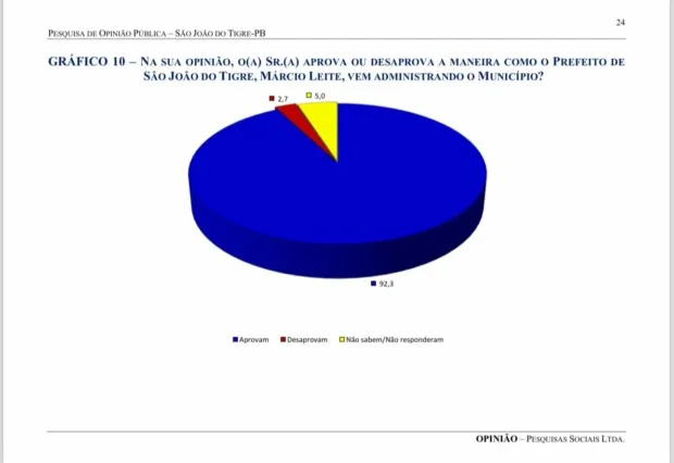 A gestão do prefeito Márcio Leite tem a aprovação de 92,3% da população, enquanto 2,7% desaprovam e 5,0% não souberam opinar. Essa é uma das maiores aprovações na região do Cariri paraibano, onde o município está situado.