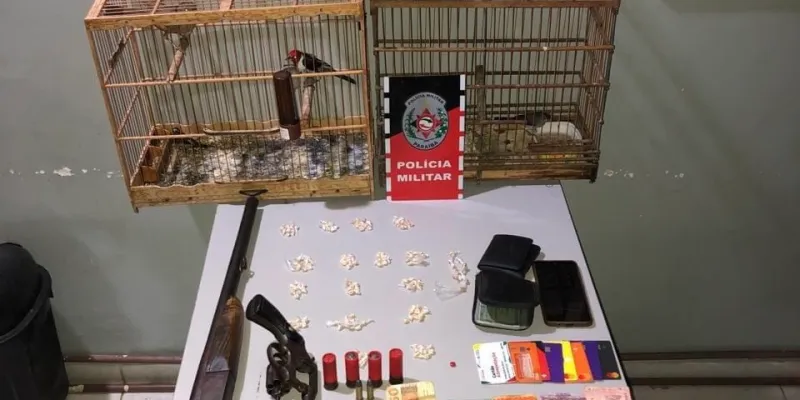 Na residência foi localizado uma espingarda cal.12 com 4 munições, um revólver cal.38 com 2 munições, sete cartões de crédito, duzentos e dois reais e quarenta e cinco centavos, 168 unidades de substâncias análogas ao crack, sete aves silvestres e um aparelho celular Samsung.