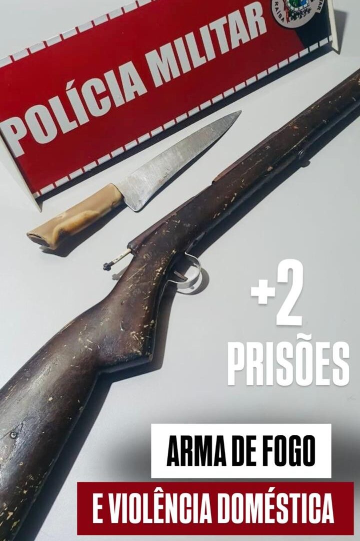 A ação ocorreu após o atendimento a uma denúncia de violência doméstica. Um dos suspeitos foi preso por agressão, com base na Lei Maria da Penha, enquanto o outro foi detido por porte ilegal de arma de fogo.