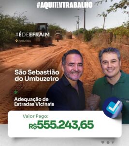 “O investimento na infraestrutura das estradas vicinais contribuirá significativamente para o bem-estar da população especialmente da zona rural. Agradeço o apoio do senador Efraim Filho e pela dedicação em sempre atender as necessidades de São Sebastião do Umbuzeiro,” disse.