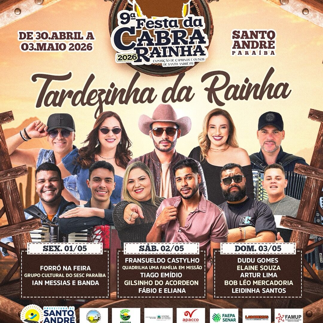 O prefeito de Santo André, Edglei Amorim, divulgou oficialmente a programação da “Tardezinha da Rainha”, um dos momentos mais aguardados da 9ª edição da Festa da Cabra Rainha, que acontecerá entre os dias 30 de abril e 3 de maio de 2026, no município caririzeiro.