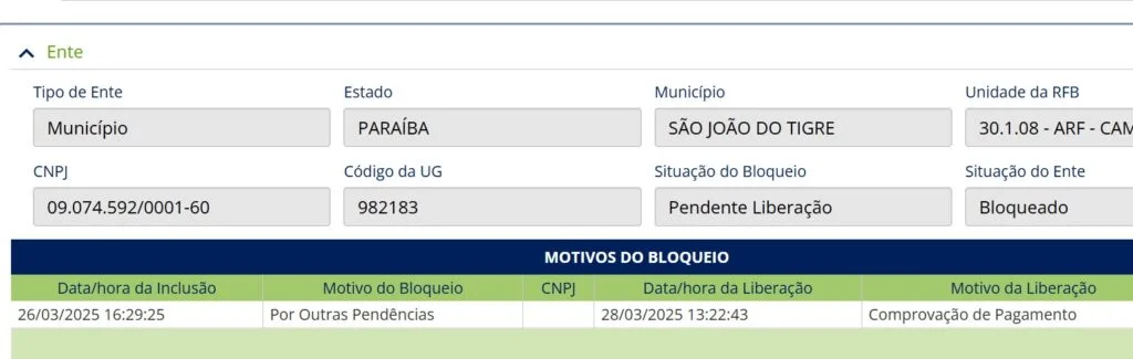 Segundo Márcio Leite, a pendência ocorreu porque a Receita Federal não debitou em conta corrente o Documento de Arrecadação de Receitas Federais (Darf) referente ao parcelamento do município. No entanto, assim que a situação foi identificada, a administração municipal efetuou o pagamento da parcela no mesmo dia 28, resultando no imediato desbloqueio do FPM.