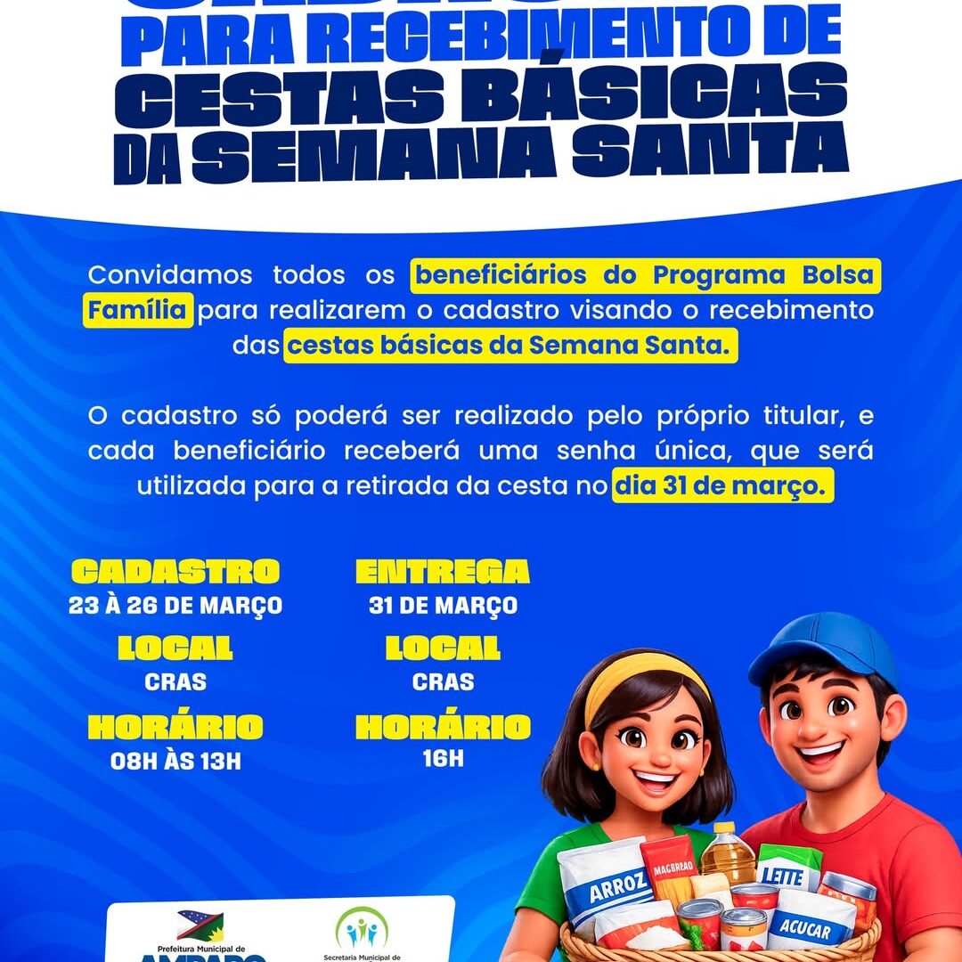 A Prefeitura Municipal de Amparo, por meio da Secretaria de Assistência Social, anunciou a abertura do cadastro para a distribuição de cestas básicas alusivas à Semana Santa. A iniciativa é voltada aos beneficiários do Programa Bolsa Família no município.