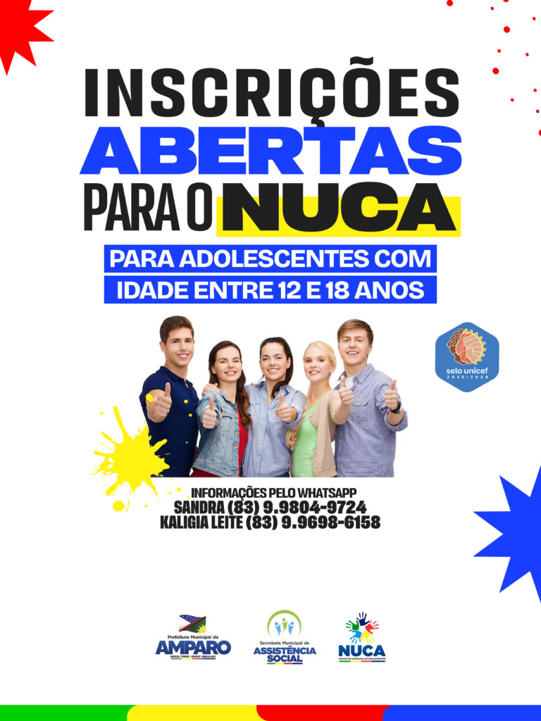A Prefeitura de Amparo informa que estão abertas as inscrições para o Núcleo de Cidadania dos Adolescentes (NUCA), voltado para jovens com idade entre 12 e 18 anos.