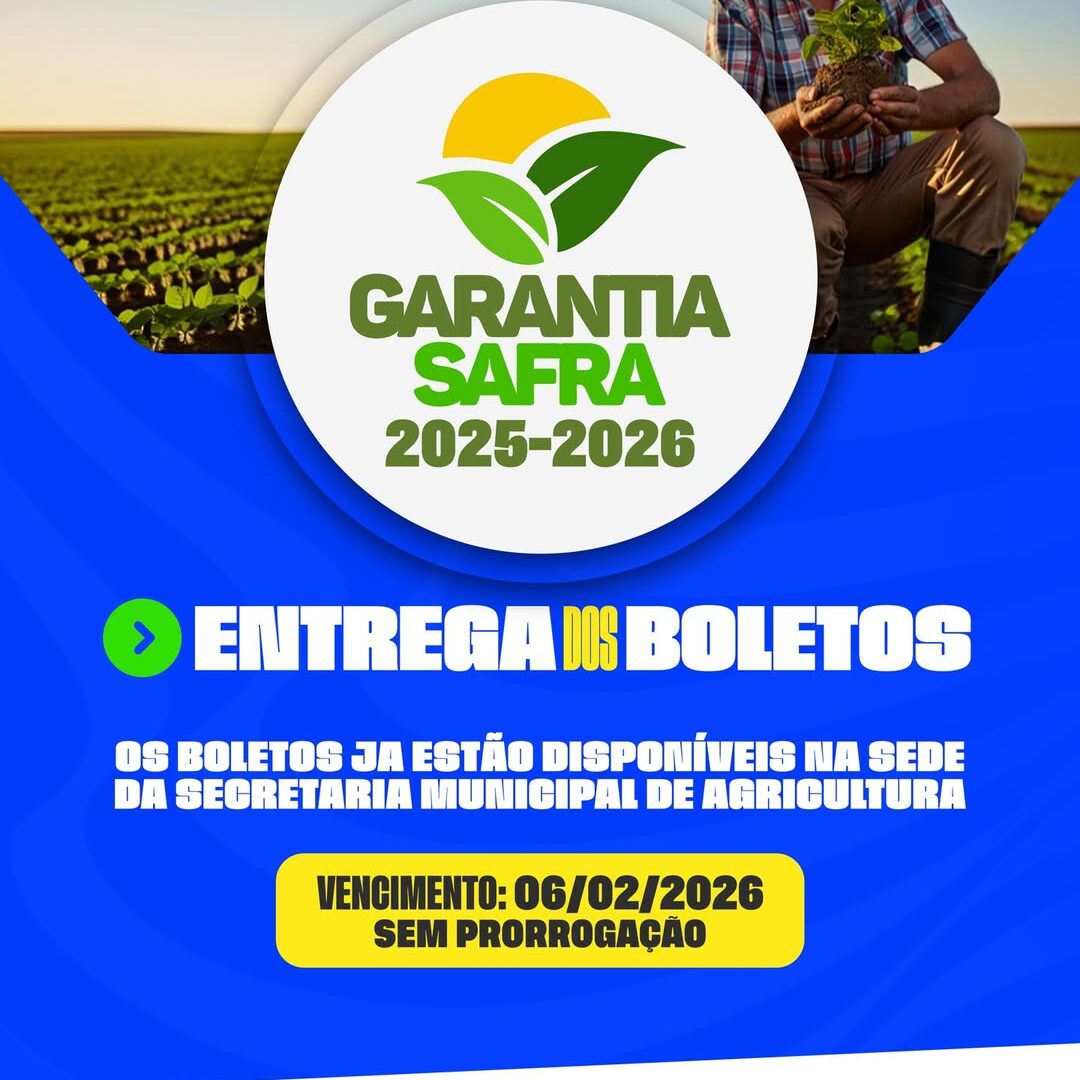 A Prefeitura de Amparo, por meio da Secretaria Municipal de Agricultura, informa aos agricultores cadastrados no Programa Garantia-Safra 2025/2026 que os boletos para pagamento já estão disponíveis para retirada.
