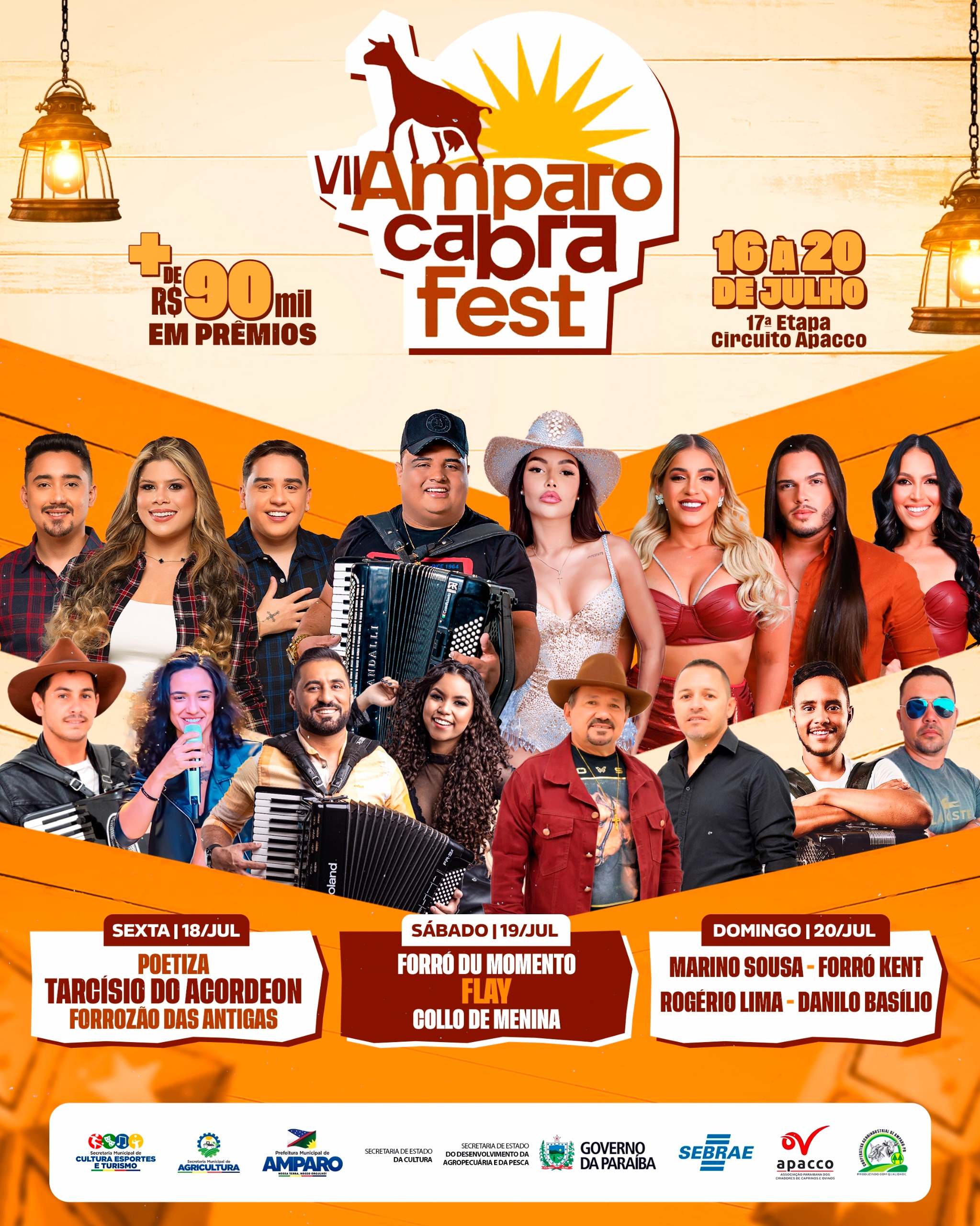 A Prefeitura de Amparo, por meio da gestão do prefeito Tarcio Gabriel, divulgou a programação oficial e os horários dos shows do VII Amparo Cabra Fest, que acontecerá nos dias 18, 19 e 20 de julho de 2025. O evento, já consagrado como a maior celebração cultural do município, vai reunir artistas locais e grandes nomes do forró em três dias de festa, tradição e muito arrasta-pé.
