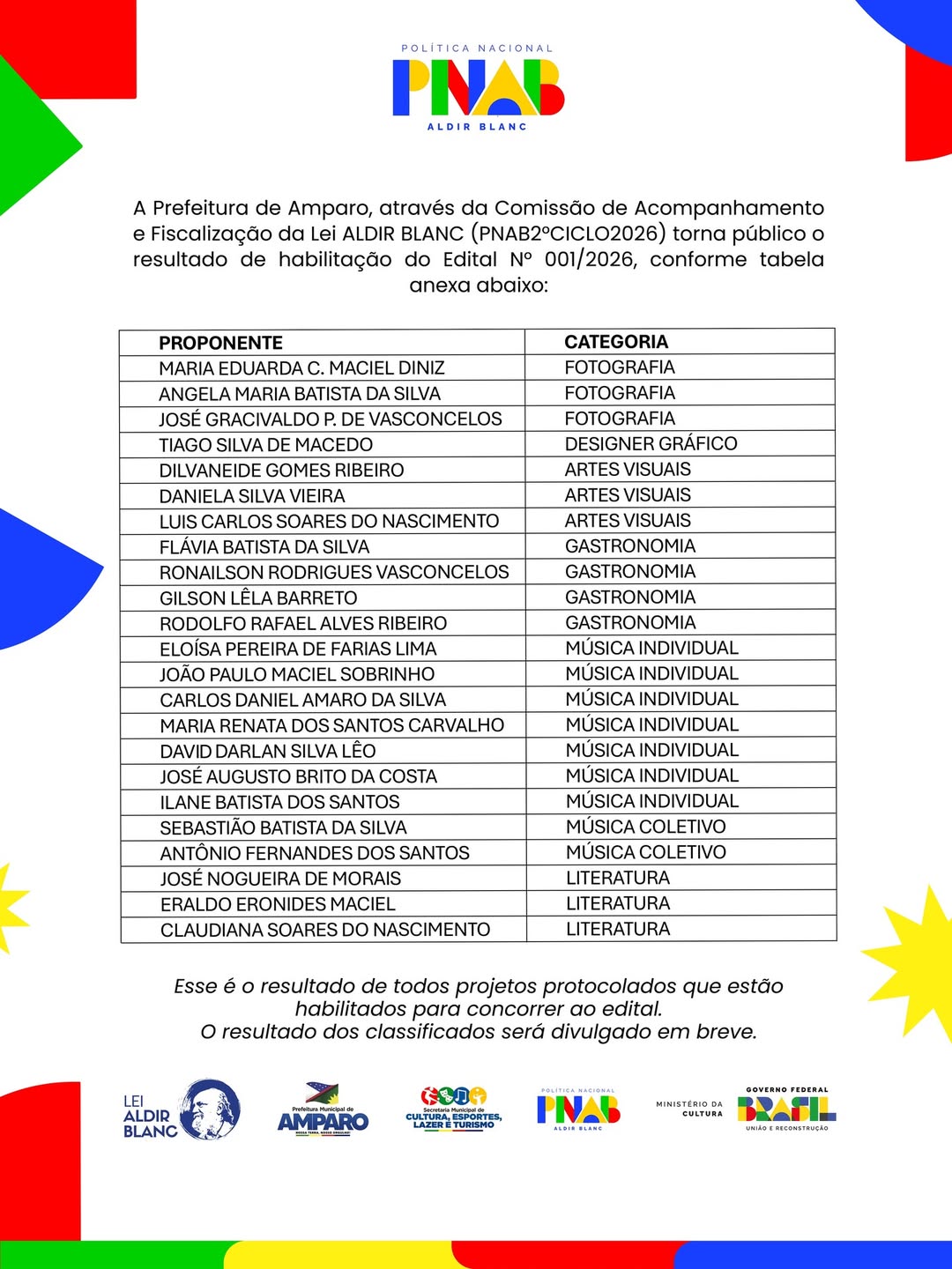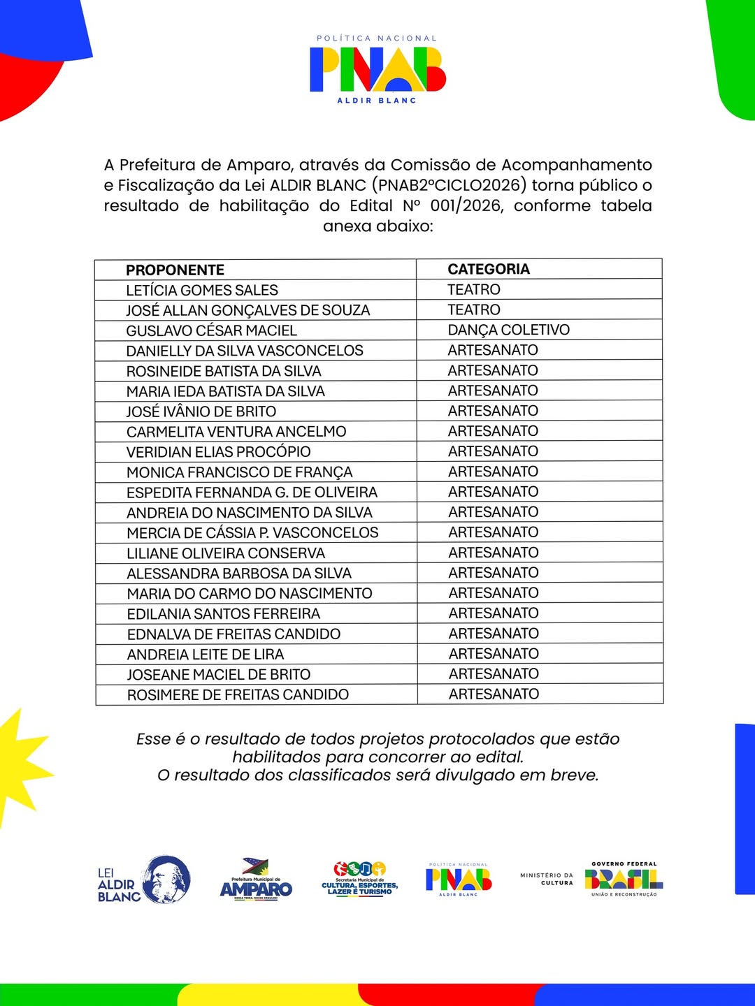 Com a divulgação, os proponentes habilitados seguem para as próximas fases do edital, contribuindo para o fortalecimento do cenário cultural do município. O resultado contempla iniciativas que evidenciam o talento, a dedicação e a diversidade cultural local, reunindo artistas, produtores e demais agentes culturais.
