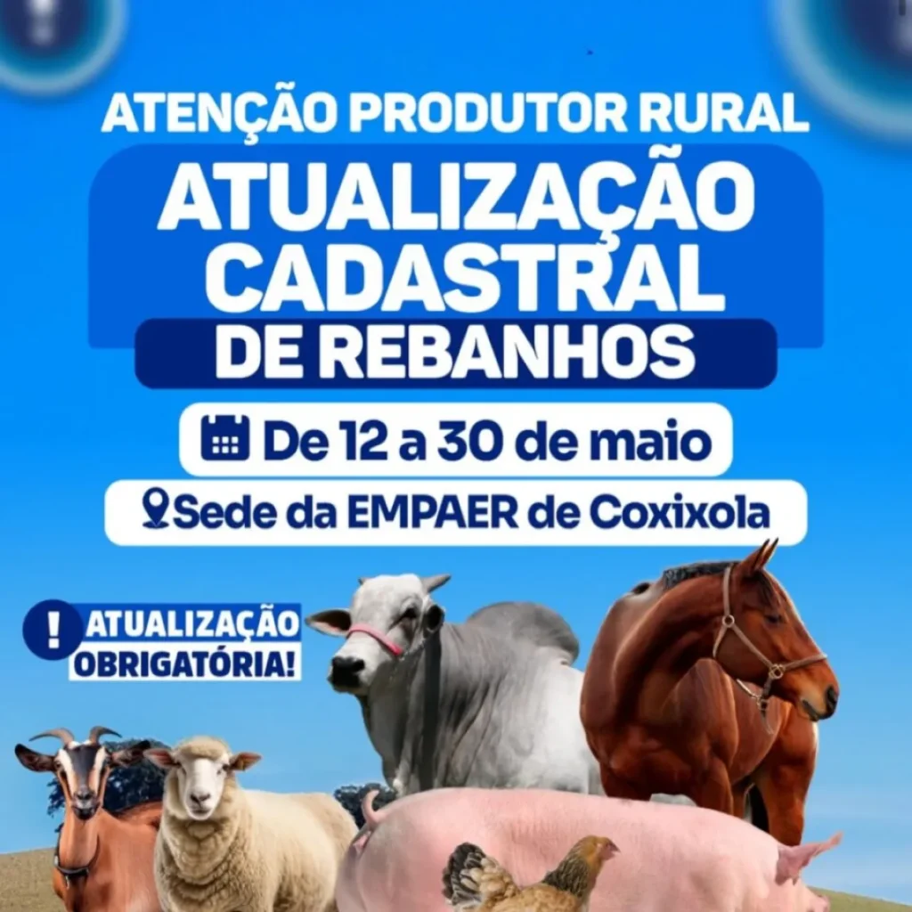 De acordo com a gestão, o prazo vai de 12 a 30 de maio, e todos os produtores rurais devem comparecer à sede da EMPAER de Coxixola para realizar a atualização. A iniciativa é obrigatória e tem como objetivo evitar penalidades, além de manter os dados dos rebanhos devidamente em dia junto aos órgãos de fiscalização.