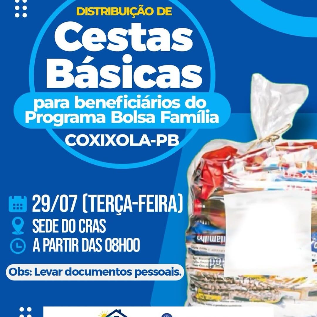 A partir das 8h, na sede do CRAS, será feita a distribuição de cestas básicas para os beneficiários do Programa Bolsa Família.