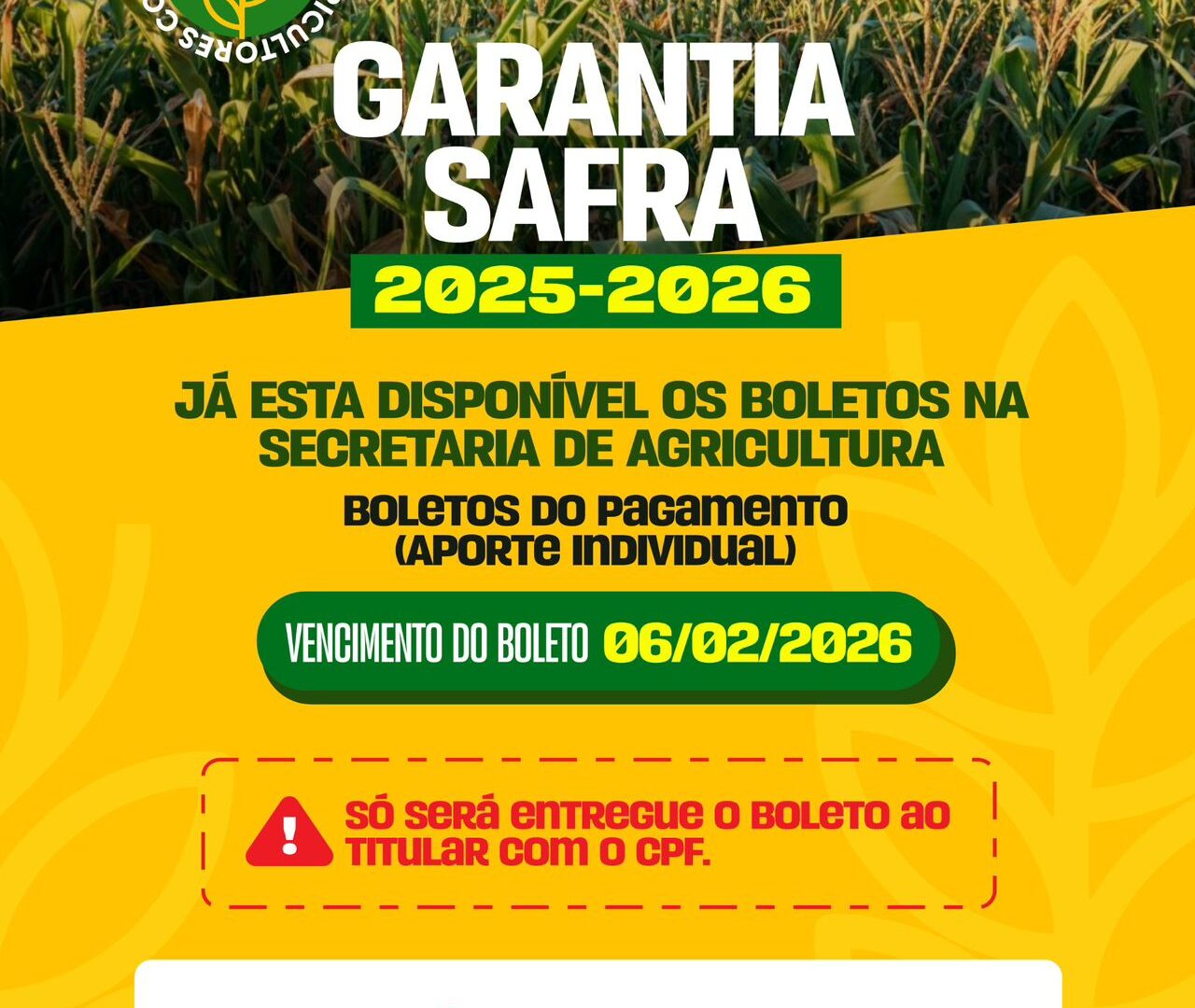 Para receber o boleto, é obrigatório apresentar o Cadastro de Pessoas Físicas (CPF). O vencimento é dia 02 de fevereiro 2026, a secretaria pede uma atenção para que os agricultores não perca o prazo.